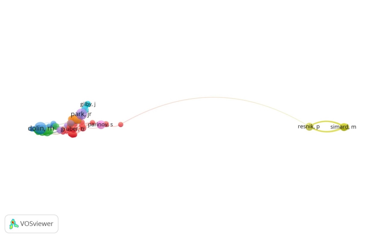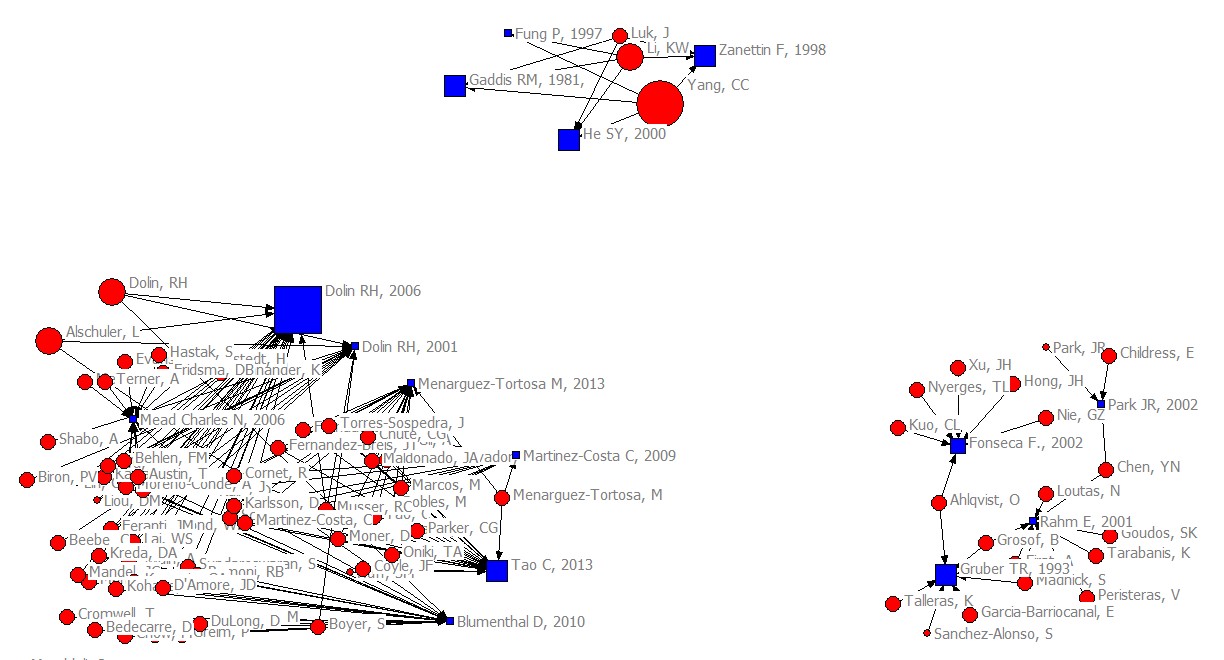 Os círculos vermelhos correspondem aos autores citantes e os quadrados azuis as publicações citadas. A rede de citações apresenta os 15 trabalhos mais citados, com três citações ou mais, e todos os autores que citam esses 15 trabalhos, sendo que o mais produtivo é Christopher C. Yang, com quatro publicações no conjunto de dados bibliográficos analisados. Gruber (1993) também aparece como um dos trabalhos mais citados nos artigos de CI, com quatro citações. Mas é possível notar a segmentação na rede de citações nessa área, que na realidade não é uma rede única, mas sim, três redes separadas e Gruber (1993) está em uma rede, enquanto Dolin et al. (2006) estão em outra. Na rede da parte superior da imagem, existem três trabalhos, Gaddis (1981), He (2000) e Zenettin (1998), que possuem quatro citações.