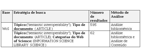 A coleta de dados foi realizada em junho de 2018 e não se adotou delimitação de período. Realizou-se a análise de indicadores bibliométricos dos artigos sobre interoperabilidade semântica em geral, sem delimitação de área, e dos artigos classificados na categoria Information Science Library Science da WoS[2]. Nesse segundo conjunto de artigos, realizou-se também a análise de conteúdo dos textos completos. A análise bibliométrica das pesquisas em geral, sem delimitação de área, teve como propósito contribuir para contextualizar a análise, bibliométrica e de conteúdo, das pesquisas desenvolvidas na área de CI.