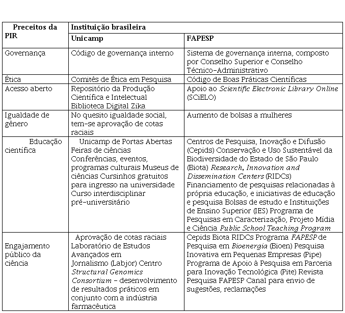 O Quadro 1 evidencia algumas das ações mapeadas pela Unicamp e pela FAPESP que estão relacionadas à PIR. A síntese dessas iniciativas aqui expostas não tem o intuito de trazer uma investigação detalhada dos princípios e procedimentos da PIR nessas instituições, pois entende-se que essas ações ainda não constituem, exatamente, políticas consolidadas, mas pode servir como um mapeamento inicial para fomentar o tema no Brasil, algo necessário, como justamente defendido por este artigo.