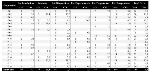 Os 153 artigos foram classificados de acordo com níveis de evidência ou estudos de Ciência Básica, totalizando 138 e 19 artigos, respectivamente. No entanto, na Tabela 1, os dados são apresentados para cada pesquisador, resultando em um total de 293 participações em publicações, por conta da coautoria. Pode-se notar, entre os tipos de estudo, a predominância de participações em Estudos Terapêuticos, ao passo que, nos Estudos Anatômicos, apenas sete pesquisadores participam, porém, apresentam a maior média total de citações (16,7).