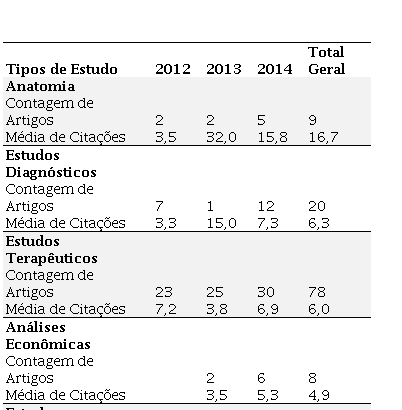 A Tabela 2 toma os artigos como unidade de análise e, mesmo desconsiderando a duplicação de dados dos diferentes autores, mantém os Estudos Anatômicos com maior média, seguidos dos Diagnósticos. É importante notar que o maior volume de citações recebidas se dá nos anos de 2013 e 2014, o que permite a observação do quanto esse indicador pode ser enviesado por algum ou por poucos artigos mais citados (já que apenas dois artigos de Anatomia receberam em média 32 citações em 2013, claramente inflando a média total deste ano). Isso pode ser um bom exemplo da necessidade de cautela na análise dos indicadores, bastando considerar o fato de que os Estudos Terapêuticos, apesar de representarem o maior número de artigos, equiparam-se em média de citações no período aos Estudos Diagnósticos. Enquanto os últimos têm sua média inflada por apenas um artigo (o artigo de 2013 representa 12% do total de citações recebidas no período), os primeiros apresentam mais homogeneidade ao longo dos anos.