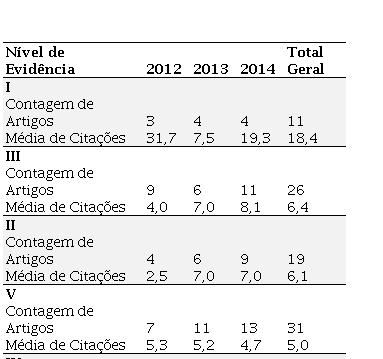 Na Tabela 3, é analisada a variável Nível de Evidência, onde se observa que os estudos do nível I foram os mais citados (média de 18,4 citações no período), recebendo maior volume de citações no ano de 2012. Os demais, com exceção do nível V, aumentaram a média de citações no decorrer do período. A frequência de artigos não sofre alterações significativas ao longo dos anos, denotando a constância de publicação dos pesquisadores do PPGOT.