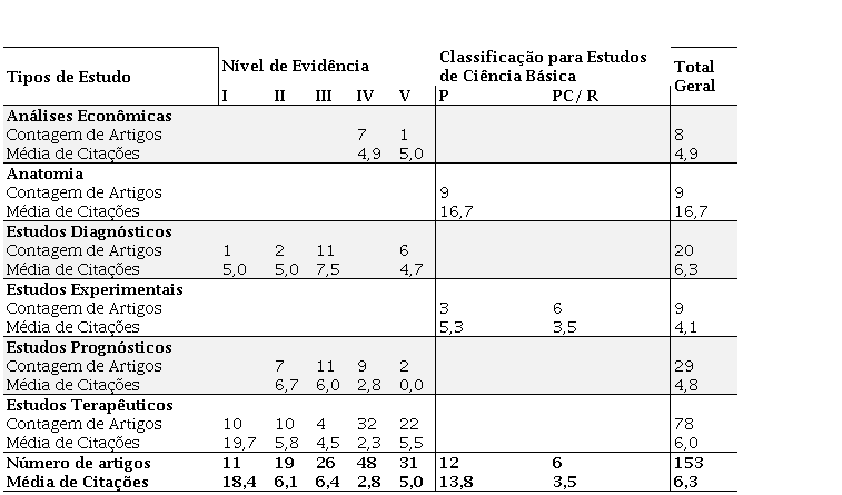 Constatou-se que os estudos classificados com nível I de evidência são os mais citados e, dentre os tipos de estudo, os de Anatomia (Ciências Básicas). Em concordância aos nossos achados, temos o estudo de Bhandari, Busse e Devereaux (2007) que concluem, em seus resultados, que artigos de Ciência Básica receberam mais citações, tanto em periódicos ortopédicos como em não-ortopédicos. Porém, ao se considerar essas variáveis em conjunto, os Estudos Terapêuticos de nível I é que se sobressaíram, por serem estudos mais comumente encontrados em periódicos de ortopedia (OKIKE; KOCHER; TORPEY, 2011).