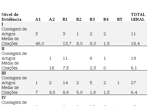 Os artigos classificados com nível I e publicados em periódicos com estrato A1 foram os mais citados (média de 46,0), conforme observado também na Figura 1. Já no estrato A2, com número de artigos apenas superior que o estrato B5, os Níveis de Evidência em destaque foram II e III.