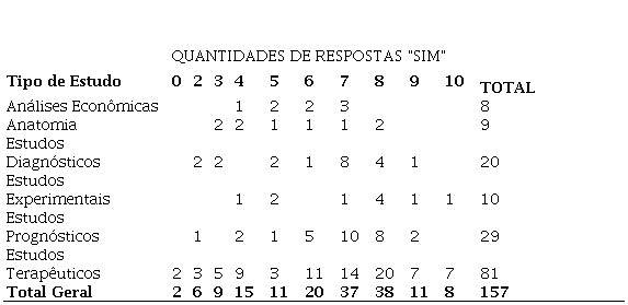 A avaliação da qualidade do conteúdo, segundo o prontuário desenvolvido por Amatuzzi (2007), consiste na aplicação de dez perguntas (cuja resposta para cada uma deve ser “SIM”, “NÃO” ou “Dúvida”). A pesquisadora NVMR, especialista em Ortopedia, procedeu a realização desta etapa, que revelou a contagem de respostas “SIM” obtida por cada um dos trabalhos selecionados. Assim, uma maior incidência de respostas “SIM” denota que o desenho metodológico está mais bem delineado, possibilitando uma maior chance de o artigo evidenciar um nível de evidência mais alto.