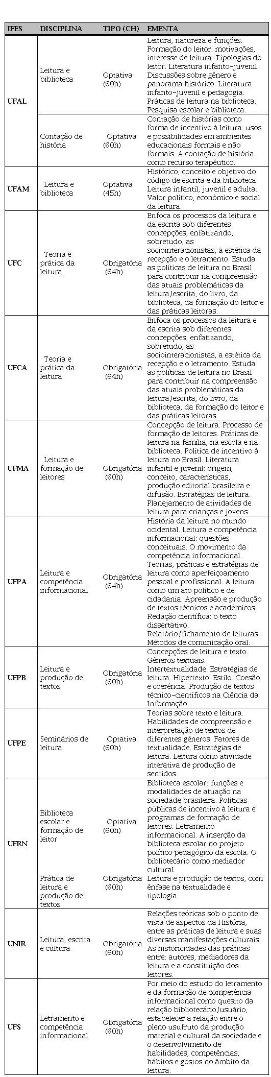 No caso da UFBA, a partir da matriz curricular e das ementas, o que observamos é que o curso de Biblioteconomia não oferece disciplina sobre leitura, sendo, portanto, a única universidade estudada onde isso ocorre. Já em relação à UESPI, não tivemos acesso nem às ementas das disciplinas. O curso não tem site, nem disponibiliza esses documentos em qualquer outro local. A única informação localizada foi a matriz curricular dos cursos, disponível no site da universidade, em que pudemos ver que existe a disciplina Leitura e formação de leitores, obrigatória, com carga-horária de 60h. Acreditamos que ela atenda aos nossos propósitos, por isso a incluímos no Quadro 1, mas pontuamos a necessidade da ementa para melhor análise.