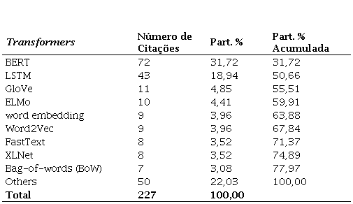 O transformer BERT foi o mais citado, mesmo sendo o transformer mais novo, justamente por ser muito versátil em NLP. BERT foi construído originalmente com bases de testes em inglês, mas tem funcionalidades em outros idiomas. Muitos artigos utilizaram BERT em tradução para idiomas específicos e obtiveram um resultado melhor do que utilizando as bases internas de treinamento do BERT. Os autores dos artigos analisados apontaram uma preferência por usarem BERT, LSTM, GloVe e ELMo. Esses transfomers correspondem por 60% das citações, e possuem funcionalidades próprias para NLP. Além desses, foram citados os seguintes transformers e arquiteturas: CNN, GPT, GRU, RNN, BART, ConvNet, ERNIE, Flair, BLEU, Byte Pair Embeddings, CapsNet, Connectionist Text Proposal Network (CTPN), Context2vec, Cui2Vec, Dict2vec, Embeddings of Semantic Predications (ESP), Graph2Graph, GTrXL, KT-NET, MINILM, ngram2vec, OpenAI transformer, Reasoner, ROUGE-L, SAO2Vec, Sent2Vec, Seq2Seq, SeqVec, SGNS, SOFSAT, SRU, Tree Transformer, TrXL, T-XL, USE e XLM. Esses resultados estão apresentados na Tabela 1: