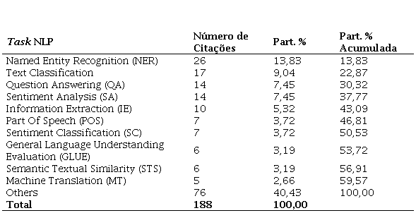 Dentre as Tarefas de NLP, é possível identificar aquelas com forte correlação com a Ciência da Informação, como Text Classification, Information Extraction (IE), Semantic Textual Similarity (STS), Relation Extraction (RE), Document Classification (DC), Reinforcement Learning (RL), Text Representation, Transfer Learning (TL), Extractive Summaries, Relation Classification (RC), Semantic Role Labeling (SRL) e Subject–Action–Object (SAO). Essas tarefas totalizam 28% das citações. Se NER for considerado um tipo de classificação, esse total sobe para 42%. Esse tipo de resultado aponta o quanto os conceitos e ferramentas, próprias da Ciência da Informação são utilizadas em outras áreas do conhecimento para otimização de funções.