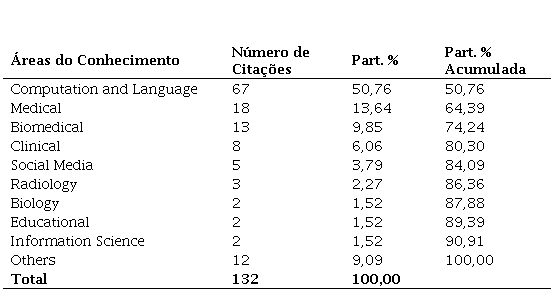 Foram identificados dois artigos focados em Ciência da Informação. Dentre Others foi identificado um artigo na área de risco de crédito, no qual os autores utilizarem NLP para ponderar empréstimos, e outro na área de Maintenance, voltado para manutenção de geradores. Os dados sobre a quantidade de citações por áreas do conhecimento estão descritos na Tabela 3.