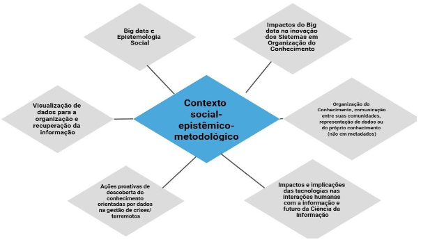 As pesquisas do contexto acadêmico reconhecem a intensidade de dados existentes no big data como forma de ampliação das descobertas científicas por meio da organização dos dados científicos. Essas descobertas tornam-se necessárias para viabilizar o acesso ao conhecimento que possivelmente está perdido nessa massa de dados. Já o contexto social-epistêmico-metodológico -em sua diversidade de pesquisas - considera o aspecto social da Organização do Conhecimento como elemento fundamental na produção e no acesso aos dados.