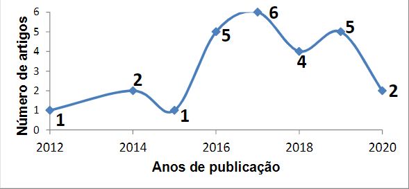 O universo desta pesquisa foi constituído a partir da coleta de artigos nas bases de dados Scopus, Web of Science, LISA e BRAPCI, por meio de buscas realizadas entre novembro e dezembro de 2020, com os seguintes termos: “big data” AND “knowledge organization” OR “organização do conhecimento” OR “information organization” OR “organização da informação”. Ressalta-se que as buscas foram realizadas sem delimitação de tempo nas bases de dados, almejando-se uma recuperação temporal mais abrangente. Quanto à distribuição temporal dos artigos do universo de pesquisa (gráfico 1), nota-se que a primeira publicação foi realizada somente em 2012, com o título “Big data era”, sob autoria de Shuichi Iwata (2012) e publicada pelo periódico “Journal of Information Processing and Management”. Esse artigo aborda ações proativas de descoberta de conhecimento orientadas por dados na gestão de crises, como, por exemplo, a ocorrência de terremotos. É possível afirmar que as discussões são recentes na área e com escassa produção ao longo dos anos, com um discreto acréscimo a partir de 2016.