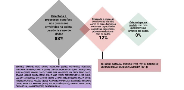 A categorização a seguir foi elaborada por Ekbia et al. (2015) para literatura sobre big data e consiste na seguinte estrutura: orientada ao produto com foco quantitativo no tamanho dos dados; orientada aos processos, com foco nos processos envolvidos na coleta, curadoria e uso de dados; e, orientada à cognição com foco na maneira como os seres humanos, com suas capacidades cognitivas específicas, podem se relacionar com os dados. A seguir, a figura 4 representa uma síntese dos resultados.