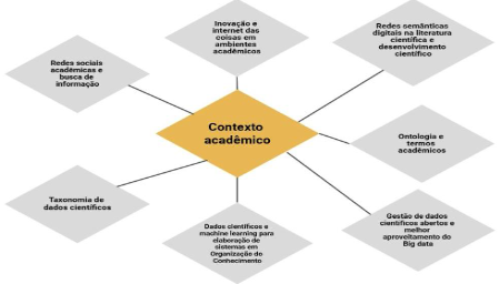 Neste contexto são apresentadas pesquisas relacionadas ao âmbito acadêmico e focadas, portanto, em compreender sob quais formas os dados científicos podem colaborar para o desenvolvimento da ciência. A figura 7 apresenta os principais temas do contexto acadêmico.