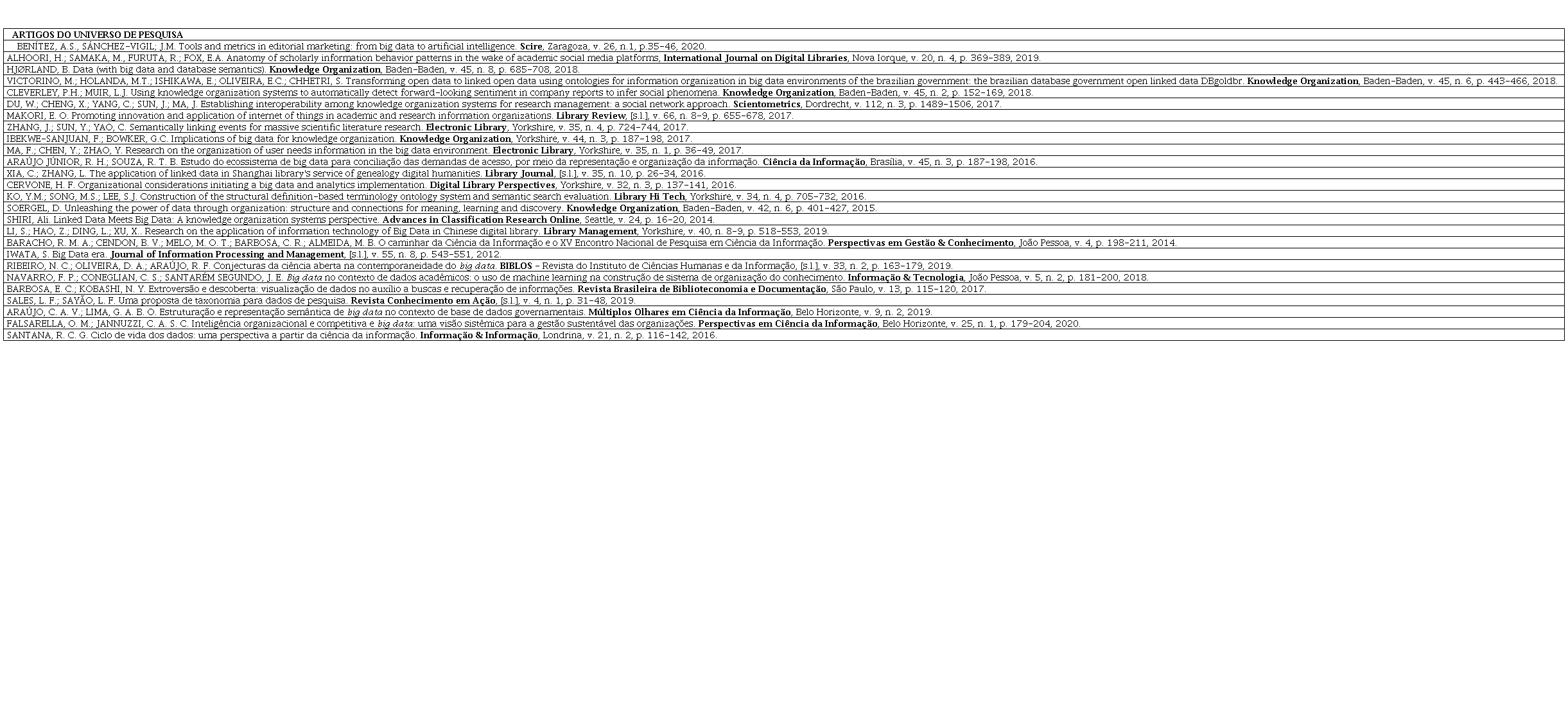 Palavras-chave: Big data, Organização do Conhecimento, Produção científica, Classificação, Ciência da Informação.