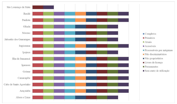 O município de São Lourenço da Mata não apresenta nenhuma informação em seu portal, excetuando-se apenas a disponibilização das informações concernentes a procedimentos licitatórios e contratos. Com isso, o princípio básico dos dados abertos permanentes não foi atendido. Vale o destaque de que todos os municípios apresentaram dados livres de licença e sem qualquer custo de utilização. O Gráfico 1 contém a avaliação completa dos princípios básicos dos dados abertos.