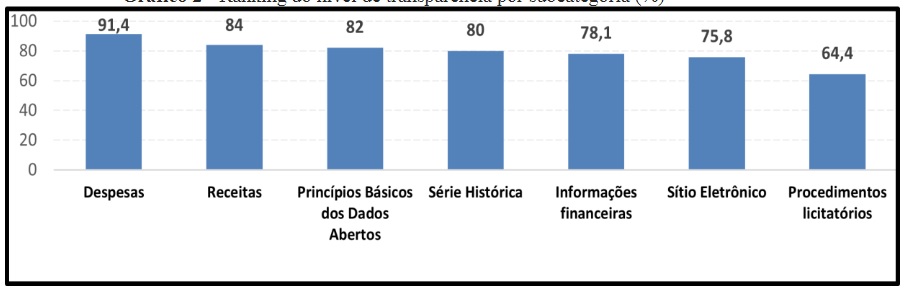 A partir dessa avaliação, foi estabelecido um ranking de classificação dos municípios, medindo o nível de transparência em percentual médio. Além disso, foi estabelecido um ranking classificatório a partir das subdivisões das categorias (despesas, receitas, informações financeiras, procedimentos licitatórios, série histórica, sítio eletrônico e princípios básicos dos dados abertos) em percentual médio. Dados os cenários, foi traçado um percentual médio geral do nível de transparência dos municípios da Região Metropolitana do Recife. A escolha da Região Metropolitana do Recife como objeto deste estudo seu deu pelo fato desta região representar, de acordo com o Plano de Desenvolvimento Urbano Integrado da Região Metropolitana do Recife, elaborado pelo Governo de Pernambuco, 42,7% da população do Estado de Pernambuco e 63% do Produto Interno Bruto pernambucano (PERNAMBUCO, 2021). Além disso, ainda de acordo com Plano de Desenvolvimento Urbano Integrado, a Região Metropolitana do Recife concentra 35% do Produto Interno Bruno da região nordeste do Brasil (PERNAMBUCO, 2021). Diante disso, a Região Metropolitana do Recife assume um protagonismo em detrimento de outras regiões do estado de Pernambuco e torna-se referência na construção de políticas públicas e de soluções no desenvolvimento de boas práticas de transparência governamental.