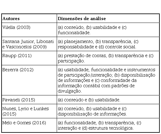 Souza e Peixe (2017) elaboraram um quadro com as dimensões de análise selecionadas por alguns autores que realizaram avaliações dos portais de transparência brasileiros; essas dimensões variam de acordo com o enfoque adotado (Quadro 1).