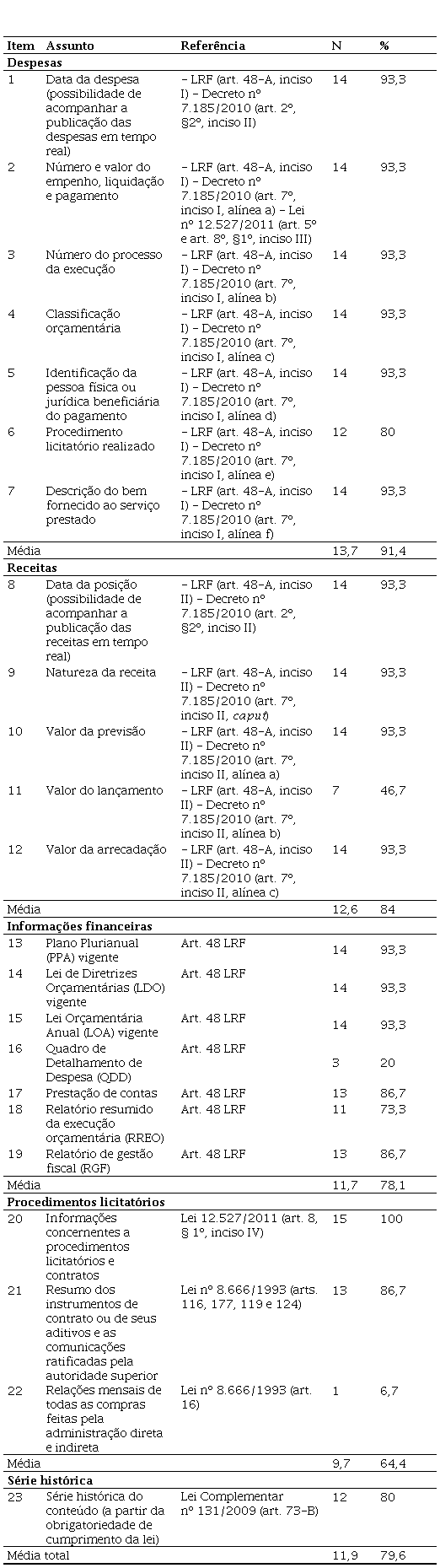 Após as devidas exclusões, os critérios de avaliação compuseram 50 itens divididos em duas seções: a) avaliação do conteúdo dos portais – despesas, receitas, informações financeiras, procedimentos licitatórios e série histórica (Tabela 1); e b) avaliação dos sítios eletrônicos (Tabela 2). Os itens não foram ponderados, visando não se inserir subjetividade e, também, pelo fato de todos os itens serem de cumprimento obrigatório. Considerando que todos os itens têm fundamentação nas legislações, pode-se afirmar que foi adotada uma abordagem condizente com a conformidade determinada por lei.