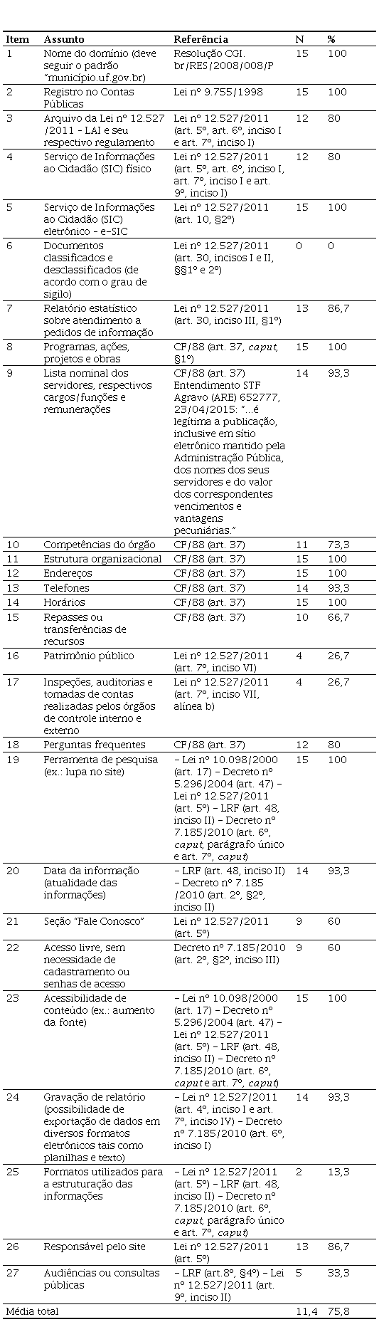 O checklist compreende 73 itens obrigatórios de transparência das informações públicas, extraídos basicamente da Constituição Federal de 1988 (BRASIL, 1988), da Lei de Transparência (BRASIL, 2009), da Lei de Responsabilidade Fiscal (BRASIL, 2000), da LAI (BRASIL, 2011) e de seus respectivos decretos regulamentadores. O documento foi adaptado para subsidiar a perspectiva do usuário do portal, por isso foram excluídos deste estudo os itens que originalmente tratavam do sistema e da regulamentação da LAI – especificamente os itens de pedidos de informação junto aos Sistemas de Informações ao Cidadão (SICs), seja por meio físico ou eletrônico. Seguindo os mesmos critérios adotados por Souza e Peixe (2017), não seria possível avaliar esses critérios apenas por meio da navegação nos portais.