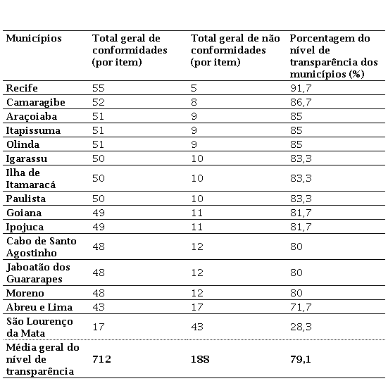 O cálculo da média de transparência dos municípios corresponde ao somatório da quantidade de itens em conformidade multiplicado por 100 e dividido pelo total de itens avaliados. O portal mais bem colocado no ranking foi o portal do município de Recife, com 91,7% de cumprimento dos itens avaliados. Já o portal do município de São Lourenço da Mata foi o pior colocado no ranking, com 28,3% de conformidade. A média geral do nível de transparência dos municípios da Região Metropolitana do Recife (RMR) foi de 79,1% (Tabela 3).