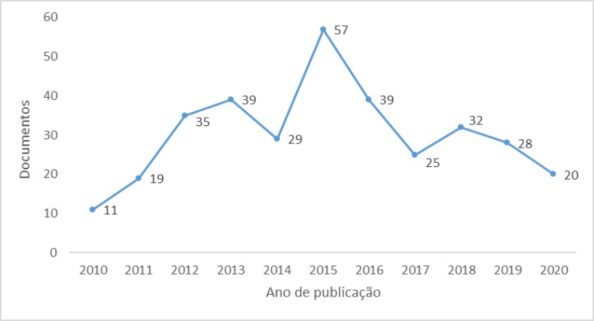 No processo de busca na Scopus, foi utilizada a expressão digital curation, entre aspas, com o parâmetro padrão (título, resumo e palavras-chave). Para delimitação, foi considerado o período diacrônico de 2010 a 2020, o que representa 11 anos. Esse período é adequado para pesquisas bibliométricas de acordo com Chueke e Amatucci (2015), que recomendam no mínimo dez anos. Esta primeira etapa resultou em 353 documentos.