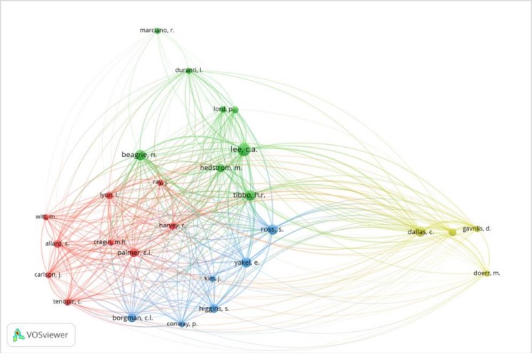 O autor mais citado (113) e com a maior força total de ligação (1960) é Lee, o que significa dizer que é o autor mais cocitado com os outros autores da rede. Além de também desempenhar o papel de autor ponte (conforme Figura 6), uma vez que liga os diferentes clusters. O segundo autor mais cocitado é Dallas (68) com força total de ligação 1692.