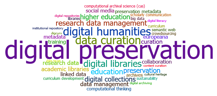 No cluster amarelo, education e training ligam-se à digital preservation. Isso pode ser explicado pela criação de programas de treinamento e cursos de nível superior em curadoria digital a nível internacional, impulsionados a partir do projeto Digital Curation Curriculum (DigCCurr) da Universidade da Carolina do Norte, nos Estados Unidos, que foi objeto de diversas conferências. O propósito do projeto é investigar as necessidades curriculares para o ensino de habilidades em curadoria digital (HIGGINS, 2011).