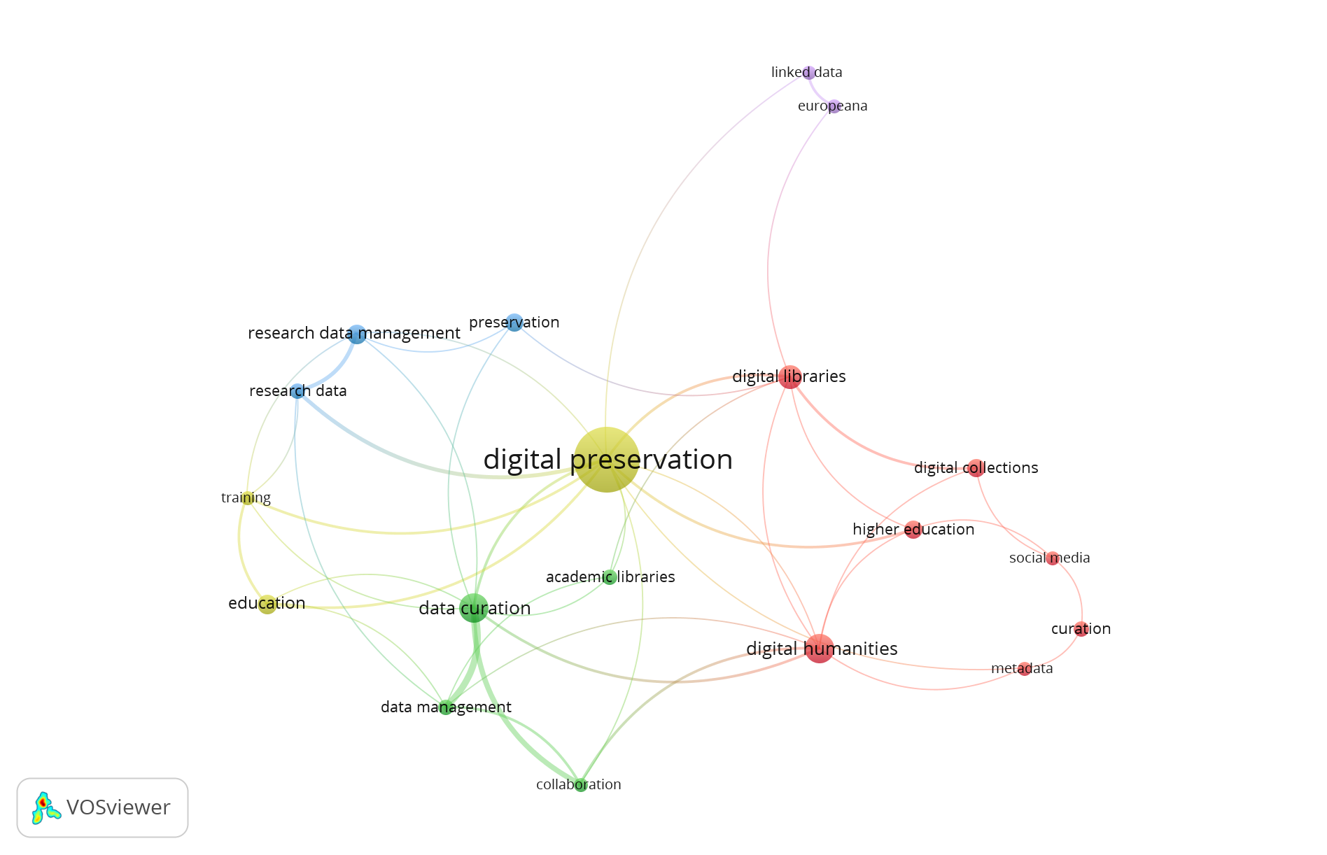 Além disso, observa-se a preocupação com a preservação dos dados resultantes de pesquisa e das coleções disponíveis nas bibliotecas, conforme indicado pelos termos digital collections e digital libraries. Isso é pontuado por Siebra, Borba e Miranda (2016, p. 32), que destacam a necessidade de uma infraestrutura para “para que os dados de pesquisa possam ser preservados e mantidos para uso futuro”.