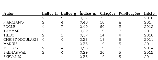 Por outro lado, Marciano é o autor mais recente do período, com início em 2017. Considerando o conjunto de dados, ele é um autor promissor, pois apesar de possuir quantidade de citações menor em relação a outros autores, seu índice-h e índice-g são semelhantes aos de Lee e seu índice-m é igual ao de Poole, o que sugere uma carreira bem desenvolvida (HIRSCH, 2005).