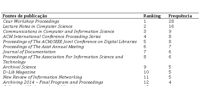 Essa análise considerou todas as fontes de publicação pertencentes à primeira zona de acordo com a lei de Bradford, agregando, portanto, periódicos e conferências. Isso significa que essas 13 fontes são responsáveis por cerca de um terço das publicações sobre curadoria digital.