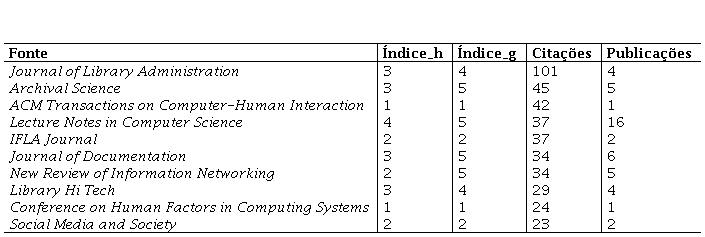 Os periódicos são as fontes de publicação mais citadas na curadoria digital, sendo o Journal of Library Administration o principal, com mais do que o dobro de citações do que o segundo colocado. Este periódico recebeu 101 citações em quatro publicações, diferentemente do Lecture Notes in Computer Science que, apesar de apresentar o maior índice-h (4) e a maior quantidade de publicações (16), possui apenas 37 citações. As fontes que apresentam poucas publicações e muitas citações merecem atenção, pois indicam publicações singulares.