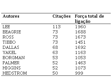 Para complementar esta análise, apresenta-se a Tabela 4 com a indicação dos autores mais citados e a respectiva força total de ligação.