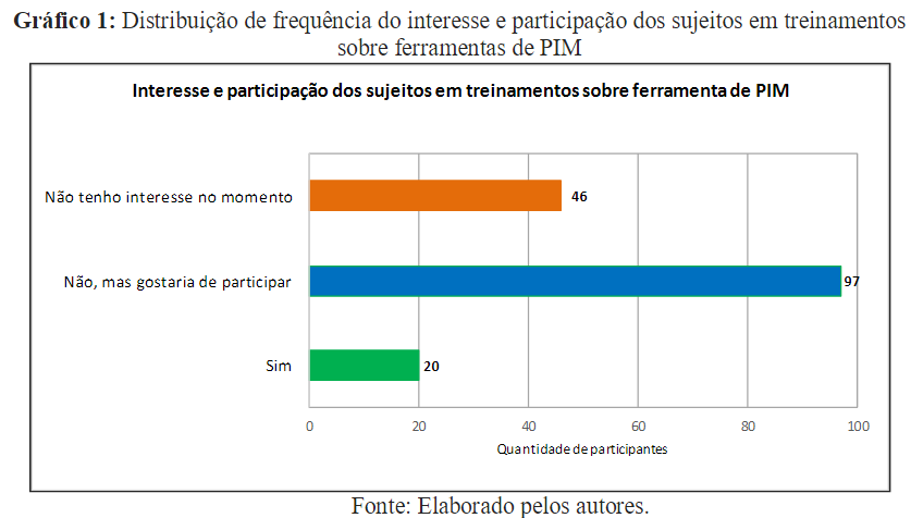 Constatou-se uma associação estatística significativa entre as variáveis participação em treinamento sobre ferramentas de PIM e sexo, indicando uma tendência dos sujeitos de sexo feminino, que ainda não participaram de treinamento, terem mais pretensão em participar que os sujeitos do sexo masculino.