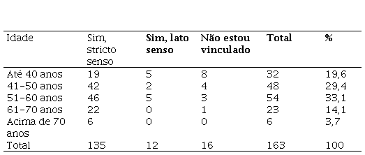 Observou-se a relação entre idade e vínculo dos participantes com os tipos de programas de pós-graduação, conforme demonstra a Tabela 1. Destaca-se que 135 (82,8%) participantes apresentaram vínculo com pós-graduação Stricto Senso.