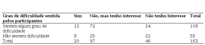 Conforme o Gráfico 1, um percentual considerável 28,2% (46) dos participantes, no entanto, afirmou não ter interesse em participar. Este percentual é próximo ao de respondentes que afirmaram não sentir dificuldades (33,7 %), conforme o indicado na Tabela 3, o que será melhor explorado mais a frente neste artigo. Deste modo, é possível que, por não sentirem esta dificuldade, eles não tenham interesse em participar dos treinamentos. Pode ser ainda que haja necessidade de uma conscientização ou, ao menos, um esclarecimento dos benefícios de uso destas ferramentas para gerenciamento de coleções pessoais aos pesquisadores.