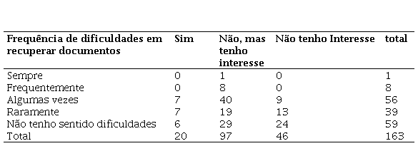 Entre as 163 respostas, destacam-se aqueles que indicaram que sentem dificuldades “algumas vezes” e ao mesmo tempo não têm interessem em participar de treinamento com 40 assinalações e também aqueles que afirmaram que não tinham sentido dificuldades e que afirmaram não terem participado de treinamento, mas que têm interesse em fazê-lo, com 29 assinalações. O teste estatístico apontou diferenças significativas na distribuição de respostas desses participantes, a saber, entre o fato de os sujeitos terem passado por treinamento sobre as ferramentas de PIM e a dificuldade de recuperar documentos em suas coleções pessoais.