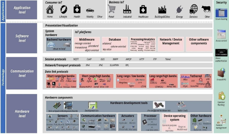 A arquitetura tecnológica por trás de um sistema de IoT é bastante variável e utiliza um vasto número de tecnologias e camadas de acordo com a especificação de cada sistema. A empresa de consultoria IoT Analytcs GmbH propõe uma arquitetura baseada em quatro níveis principais: hardware, comunicação, software e aplicação final (SCULLY, 2019). Esses quatro níveis estão permeados por camada fundamentada na segurança de dados.