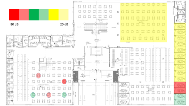 Em um nível mais avançado, o Xi processará os dados dos sons coletados e criará um mapa de calor com visualização em tempo real das variações de ruídos em cada área de estudo. Para efeito ilustrativo, a Figura 2 apresenta a planta baixa da BU/UFLA com uma simulação indicativa do nível de ruído das áreas de estudo. Esse mapa pode ser criado em um editor de imagem, como o Sketchup, para desenhar mapas mais robustos com modelagem 3D. Ou, uma solução mais sofisticada, seria apresentar o mapa de calor com imagens reais da biblioteca, com visualização similar ao Google Earth Studio, em vez de utilizar uma representação gráfica do ambiente.