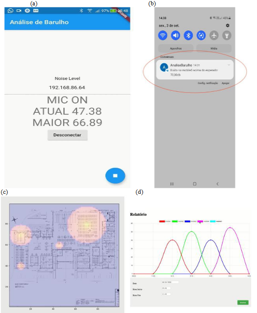 O PoC testou os seguintes procedimentos: o celular realiza a captação dos ruídos do ambiente (Figura 3a) e a cada dez segundos comunica ao servidor central o maior ruído que ocorreu no ambiente; se o ruído for abaixo do padrão estabelecido, o servidor apenas armazena o dado; se o ruído for acima do padrão, o servidor armazena o dado e emite um alerta de excesso de ruído (Figura 3b). Após o processamento desses dados, o servidor desenha o mapa de calor baseado nos ruídos (Figura 3c) e possibilita a emissão de relatórios indicativos do nível de ruído captado por cada coletor (celular) em um determinado período de tempo (Figura 3d).