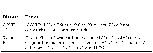 As a good scientific title should address the paper’s subject, I considered the title as a proxy of the main theme. To highlight the most frequently used keywords in papers’ titles, I performed a text mining using the tm package (FEINERER; HORNIK, 2019) associated with a word-cloud generator in the wordcloud package (FELLOWS, 2018) in R 4.0.2 (R CORE DEVELOPMENT TEAM, 2020). I excluded grammatical artifacts and the main terms from Table 1 thus analysing 26,208 words from titles of papers on Swine Flu and 404,753 words from titles of papers on COVID-19. The word cloud analysis considered only words with frequency higher than 50 uses for Swine Flu and 500 for COVID-19. I also checked the frequency of words for the ten most-used terms.