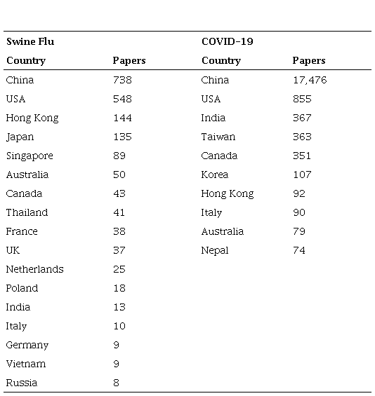 The collaboration index for papers addressing the COVID-19 was also lower than for papers addressing the Swine Flu. According to Rodrigues et al. (2020), papers are related to the scientific activity of a country and its institutions. In every country, scientific publications are fundamental in the quality evaluation of researchers and institutions (RODRIGUES et al., 2020). Number and quality of publications usually reflect the country’s investments in science and innovation as well as its economic development (MAZZUCATO, 2014). According to the World Economic Forum (2020), the three economies with greatest GDP in 2010 were USA, China, and India while in 2020 it has already changed to China, USA, and India.