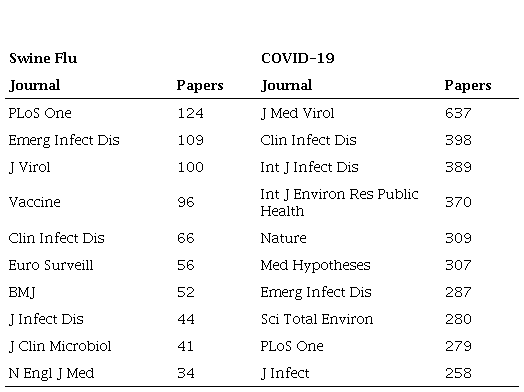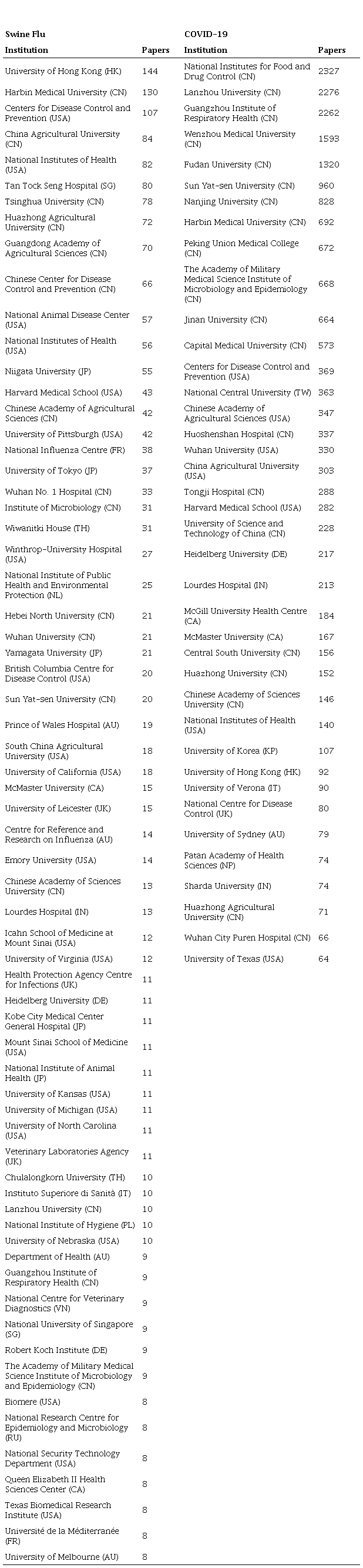 Papers were published in 948 journals to address the Swine Flu and in 4,234 journals to address the COVID-19. Although both pandemics are placed in the same thematic of biomedicine, the top ten journals receiving most of the publications in each subject were slightly different (Table 4). The journals PLoS One, Emerging Infectious Diseases (Emerg Infect Dis) and Clinical Infectious Diseases (Clin Infect Dis) stayed ahead in both lists (Table 4). While the Emerging Infectious Diseases is published by the Centers for Disease Control and Prevention (CDC) in the USA, the Clinical Infectious Diseases is published by the Oxford University Press, and PLoS One is published by the Public Library of Science in the USA.