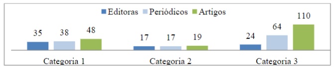 A Categoria 3 foi composta por 24 editoras e 64 periódicos, que publicaram 110 artigos. Ao cruzarmos com as informações dos países de origem das editoras, encontramo-las distribuídas em 16 países: quatro editoras da Alemanha e dos Estados Unidos, três do Reino Unido e da Turquia e uma da África do Sul, Argentina, Austrália, Coreia do Sul, Equador, Espanha, Finlândia, França, Holanda, Noruega, Polônia e Singapura.