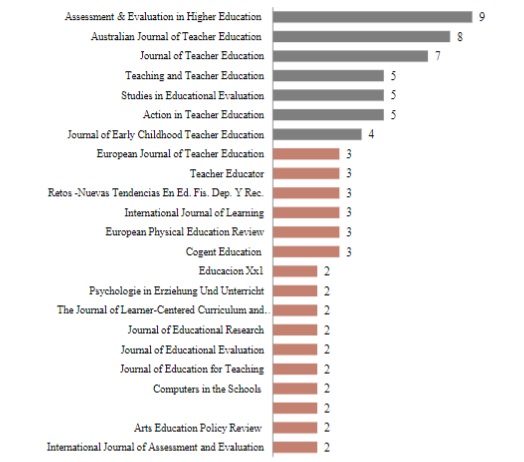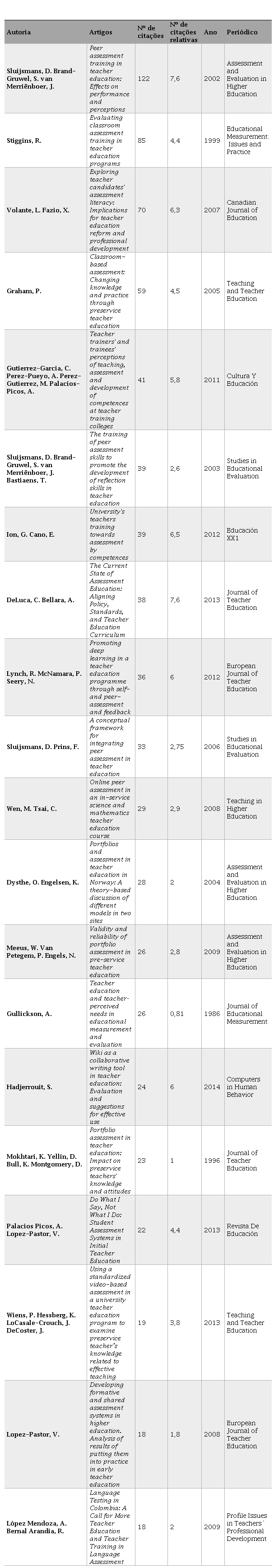 O periódico Assessment & Evaluation in Higher Education, além de ser o com maior número de publicações (nove), também é o que mais publicou dentro do Núcleo h (três artigos) e vincula o artigo com maior número de citações. Os nove artigos publicados pela revista apresentam média de 24,8 citações recebidas por trabalho, apresentando-se como uma revista de grande impacto para comunidade acadêmica no debate sobre o tema. Os periódicos Teaching and Teacher Education; Studies in Educational Evaluation; Journal of Teacher Education; e European Journal of Teacher Education também se destacam por publicarem dois artigos pertencentes ao Núcleo h.