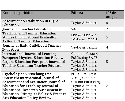 O periódico com maior número de publicações, Assessment & Evaluation in Higher Education, já em seu nome evidencia o interesse pelo tema da avaliação no ensino superior. Seu escopo relata ser uma revista internacional revisada por pares que publica artigos e relatórios sobre todos os tipos de avaliação dentro do ensino superior. Sua finalidade é promover o entendimento das práticas e processos avaliativos, particularmente a contribuição que eles trazem para a aprendizagem do aluno e para o desenvolvimento de cursos, funcionários e instituições de ensino.