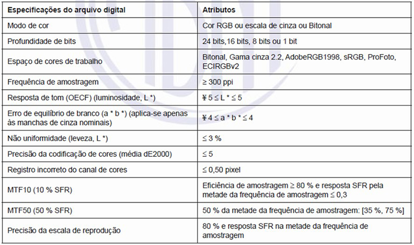 Aspectos relacionados à qualidade da imagem digital foram enfatizados na referida orientação técnica da ABNT, que recomendou parâmetros de resolução, de tonalidade e precisão de cor, por exemplo. Da mesma forma, os requisitos de metadados foram evidenciados e categorizados como metadados de identificação, técnicos e de imutabilidade, aspectos que serão detalhados na seção de análise de resultados.
