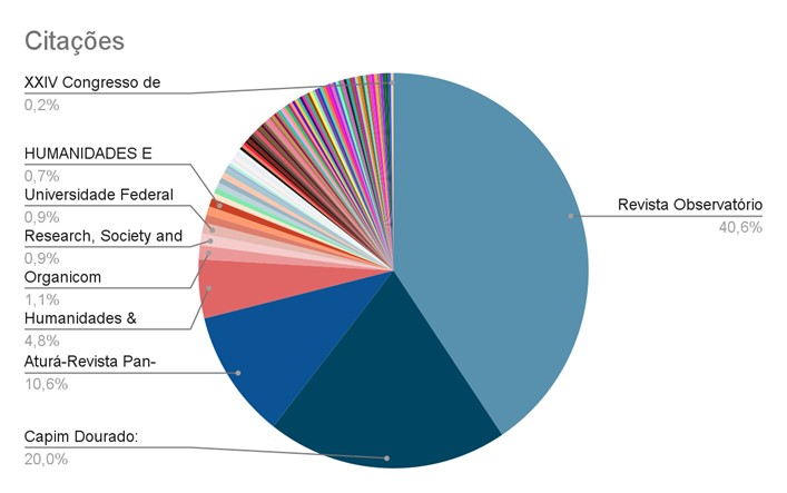 Entre os anos de 2016 a 2020, a Revista Observatório obteve 477 citações, sendo que 41 destas citações não possuem metadados estruturados para uma análise precisa sobre a fonte. De qualquer modo, destaque-se que, das 436 menções ao periódico consideradas nesta análise, 71% das citações estão concentradas em somente três publicações: