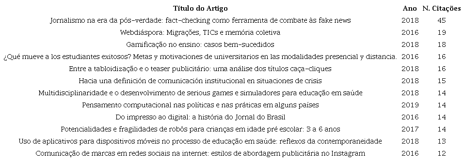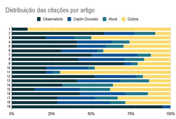 Na distribuição das citações por artigo, é possível verificar que apenas dois trabalhos possuem mais citações de outras fontes para além das três revistas predominantes. São os seguintes artigos: “Jornalismo na era da pós-verdade: fact-checking como ferramenta de combate às fake news” (artigo 1 no gráfico 2) e “Entre a tabloidização e o teaser publicitário: uma análise dos títulos caça-cliques” (artigo 11 no gráfico 2).