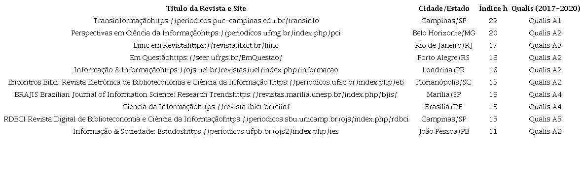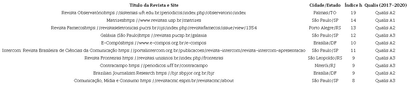 As revistas científicas selecionadas para a amostra estão organizadas conforme as tabelas 1 e 2, a seguir. Na tabela 1 estão as revistas selecionadas de Comunicação. Na tabela 2 estão as revistas selecionadas de Informação.