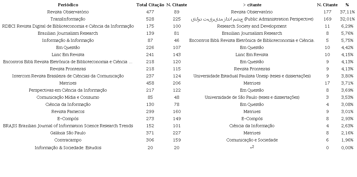 A primeira etapa da investigação empírica envolveu a tabulação de dados relativos ao número de citação e a identificação de quais são as maiores fontes de citação de cada um dos periódicos. Tal estratégia permitiu calcular a porcentagem de citação do maior citante em relação ao número total de citações.